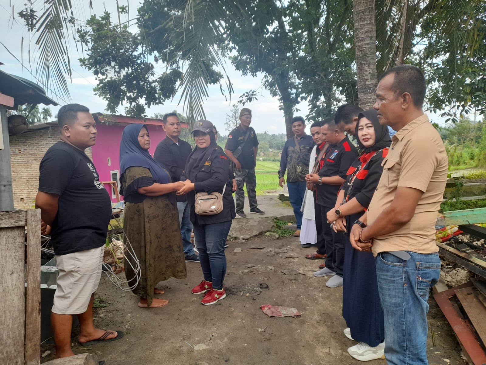 Di antara puing-puing bangunan sisa kebakaran tersebut bendahara KRNS ibu Ratna Sari Dewi menyerahkan sumbangan yang terkumpul kepada ibu Sukarni agar dapat di gunakan oleh korban untuk membeli bahan-bahan bangunan rumah secukupnya dan semoga dapat meringankan beban ibu tersebut.