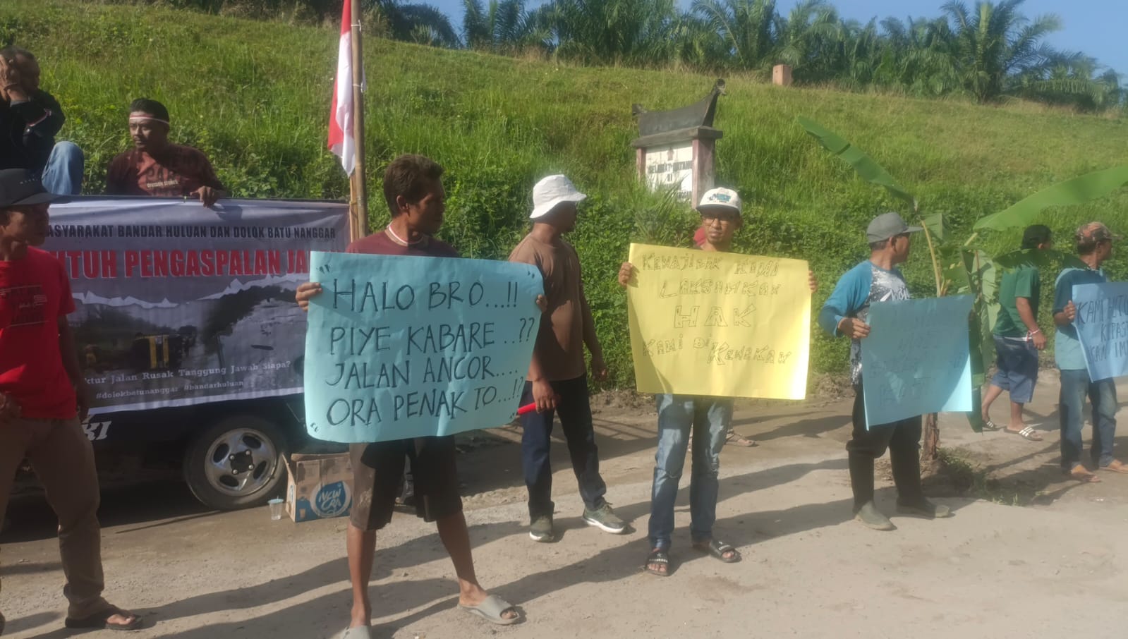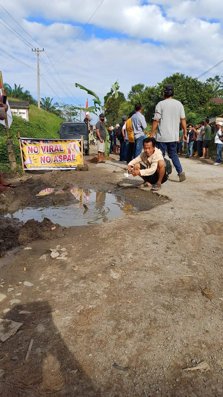 Ada ratusan warga, kaum muda mudi, kaum bapak dan ibu mengikuti aksi damai menuntut perbaikan jalan, dengan menanam pohon pisang, dan memancing ikan di jalan berlubang, serta membawa spanduk yang berisikan tulisan, “pajak naik jalan rusak, halo bro piye kabare jalan ancor ora penak toh, kewajiban kami laksanakan, hak kami di kemanakan, kami butuh karya nyata, bukan karya kata, kami butuh kepastian bukan impian,”.