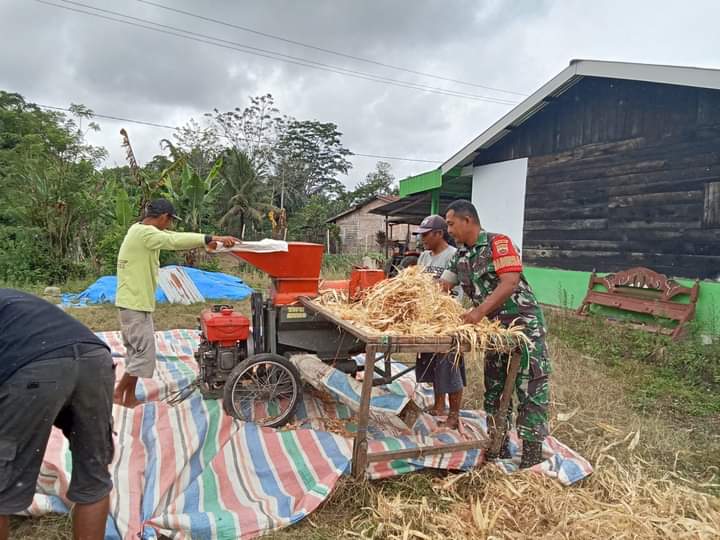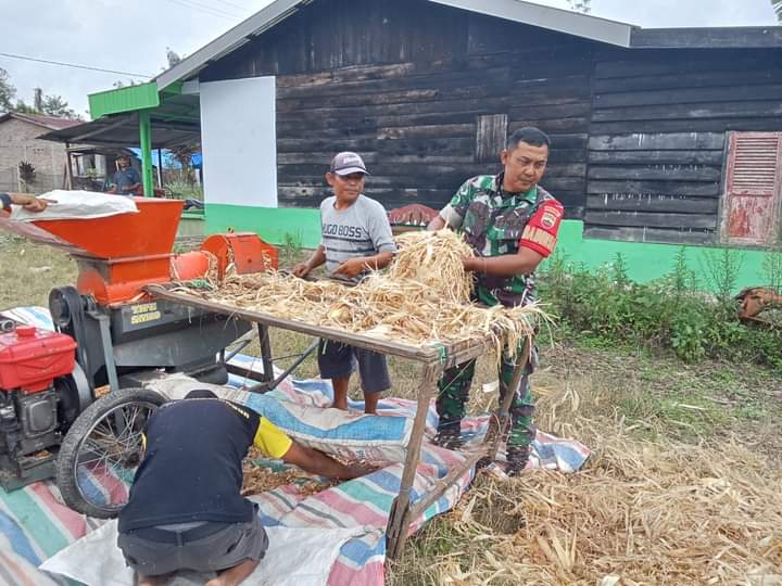 Babinsa masih dengan pakaian dinasnya membantu warga binaannya yang sedang menggiling jagung.