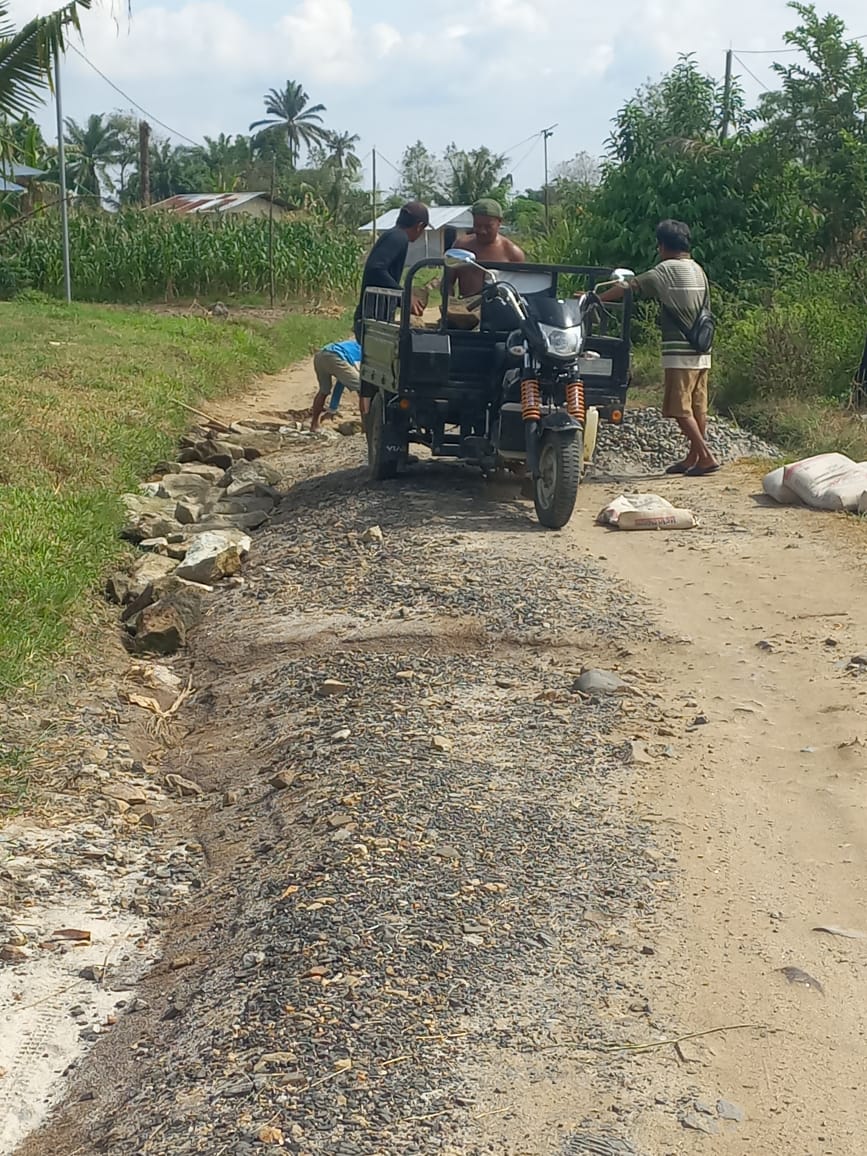 Terpantau di lokasi gotong royong, jalan yang mengalami kerusakan cukup banyak, sehingga terlihat seperti ada tali air di tengah jalan. Warga harus meninbun jalan dengan batu padas agar jalan tetap rata dan layak dilalui kendaraan.