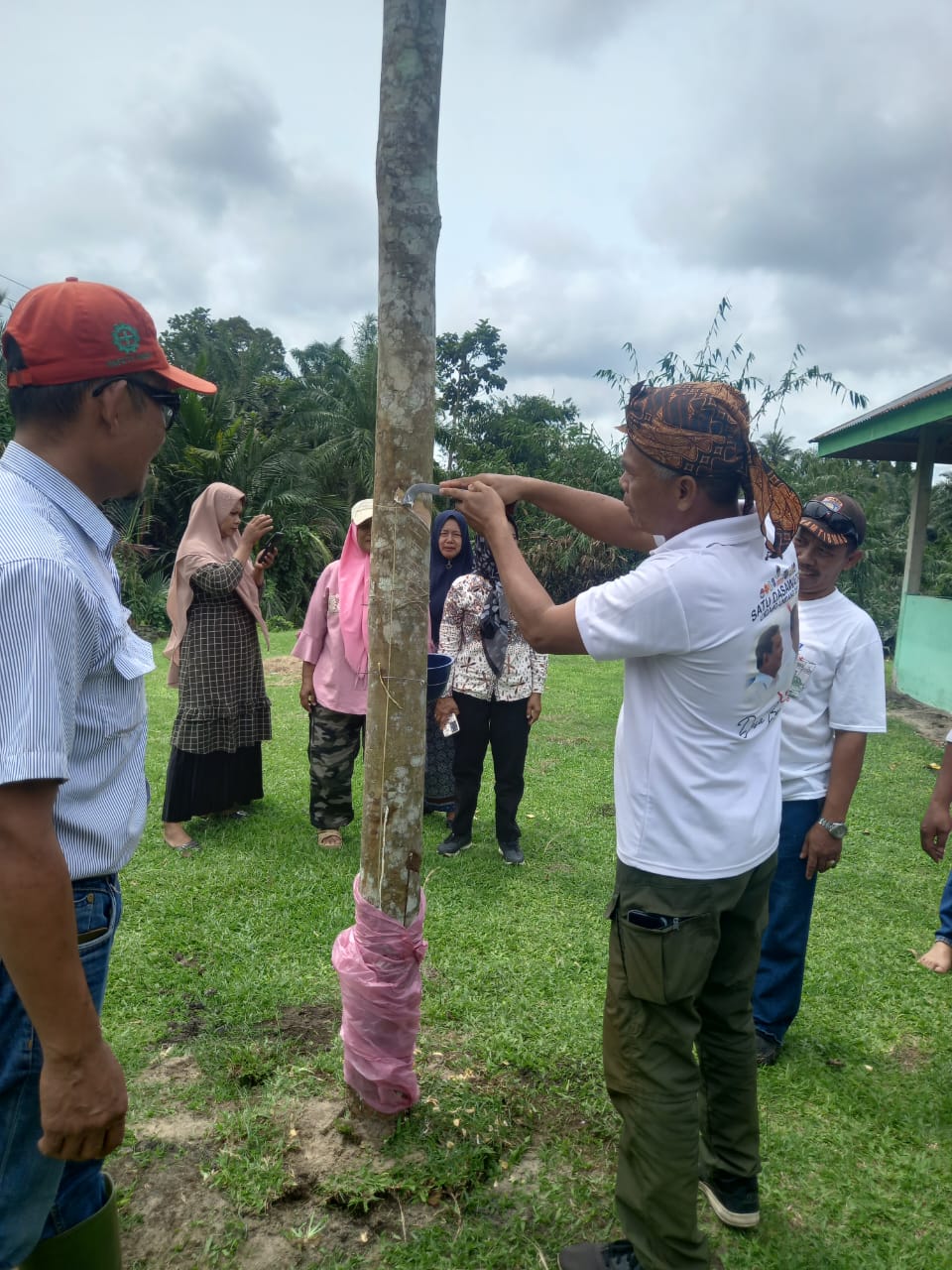 Workshop ini mencakup praktik langsung menderes atau menyadap pohon karet dengan teknik yang benar, serta penjelasan tentang perawatan, pemupukan, dan pembersihan area sekitar pohon karet.