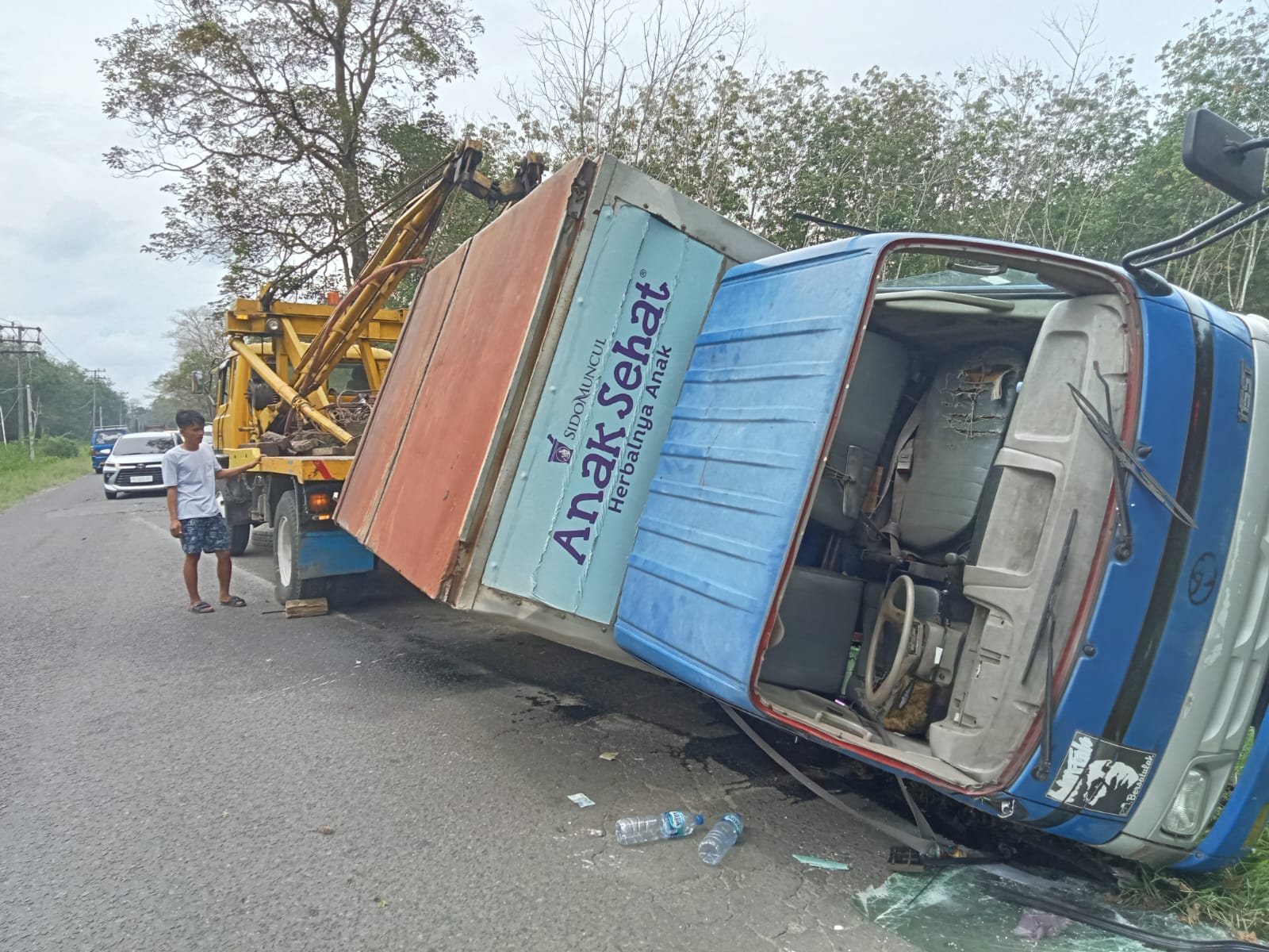 KransNews.com | Simalungun – Truk boks bermuatan jamu Tolak Angin terguling akibat mengelakkan lubang di jalan lintas Siantar Perdagangan, tepatnya di Km 12, Nagori Senio, Kecamatan Gunung Malela, Selasa (31/12/2024) sekira pukul 10.00 WIB. Tak ada korban jiwa namun kerugian ditaksir mencapai puluhan juta.