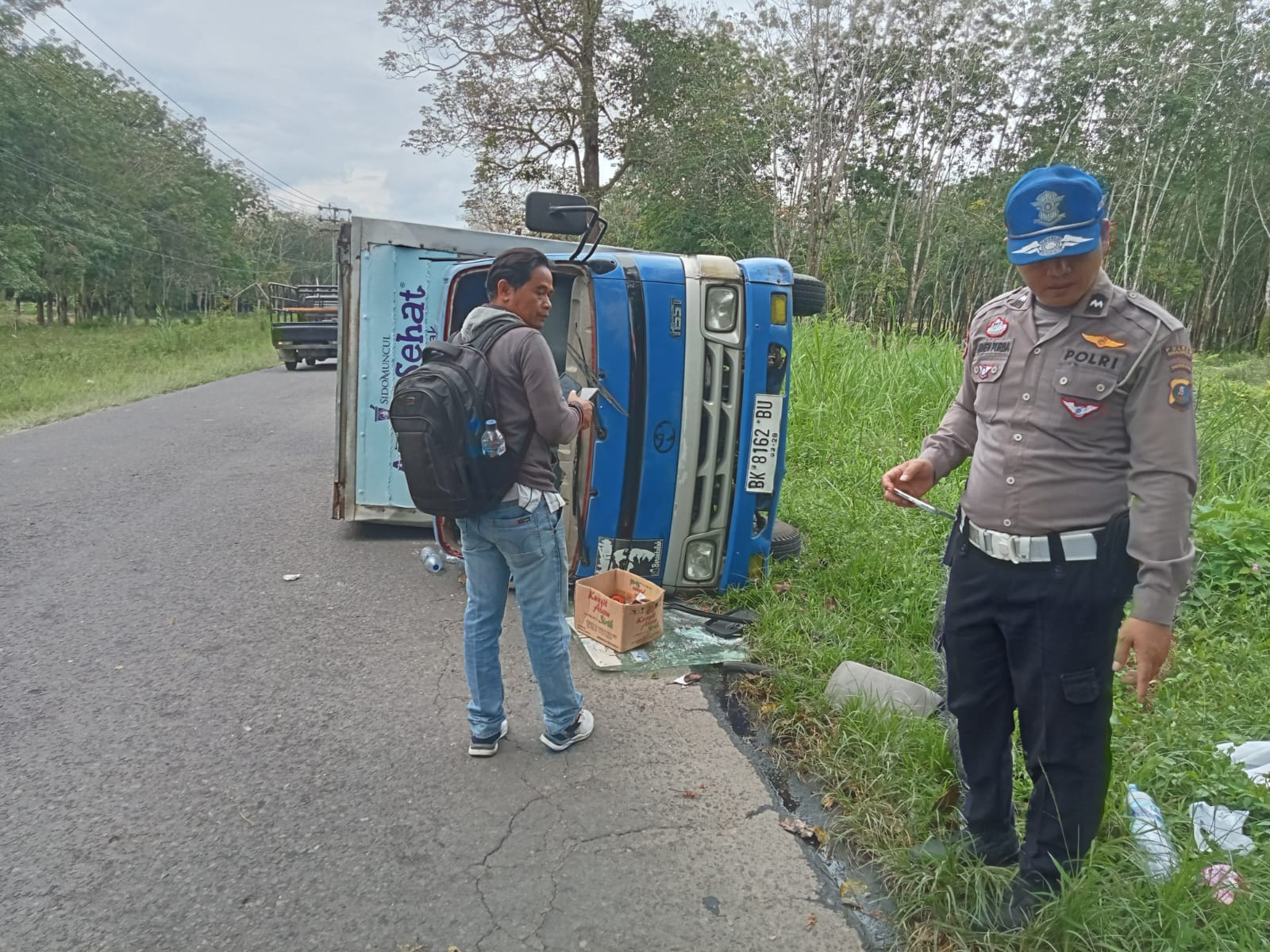 Tak lama, Personel Satlantas Polres Simalungun tiba di lokasi untuk mengevakuasi mobil boks yang terguling hingga menyebabkan kemacetan.