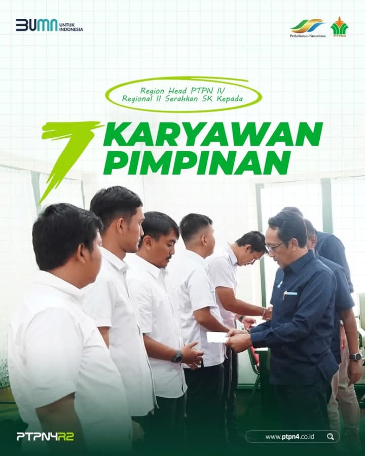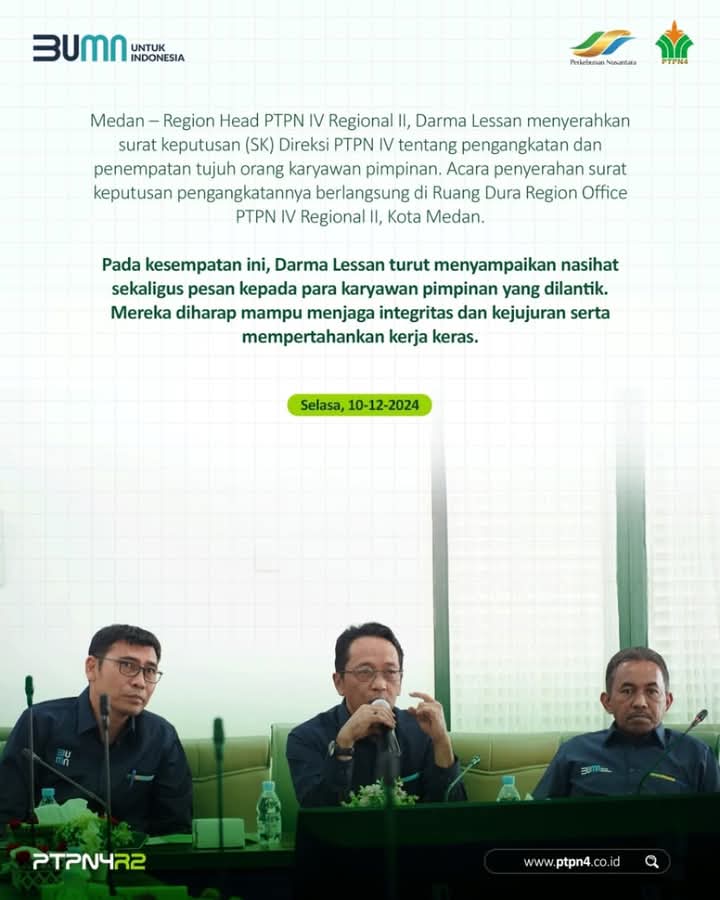 KransNews.com | Medan – Region Head PTPN IV Regional II, Darma Lessan menyerahkan surat keputusan (SK) Direksi PTPN IV tentang pengangkatan dan penempatan tujuh orang karyawan pimpinan. Acara penyerahan surat keputusan pengangkatannya berlangsung di Ruang Dura Region Office PTPN IV Regional II, Kota Medan, Selasa (10/12/2024).