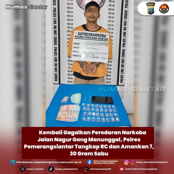 KransNews.com | Siantar – Persempit Ruang Gerak Peredaran Narkoba di wilayah hukum Polres Pemtangsiantar, kembali Satuan Reserse Narkoba berhasil menangkap RC (30) diduga pengedar narkotika jenis sabu di Jalan Nagur Gang Manunggal, Kelurahan Martoba, Kecamatan Siantar Utara, Kota Pematangsiantar pada hari Jumat 14 Februari 2025 siang sekira pukul 13.30 WIB.
