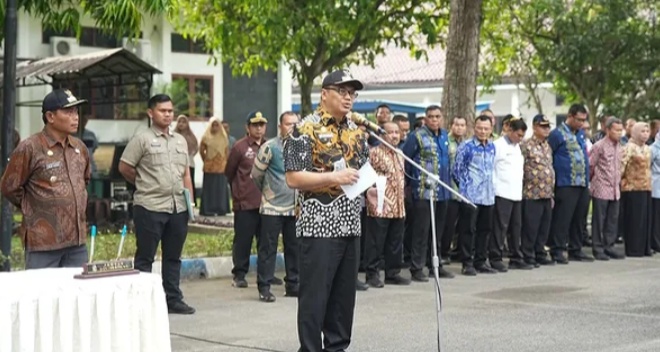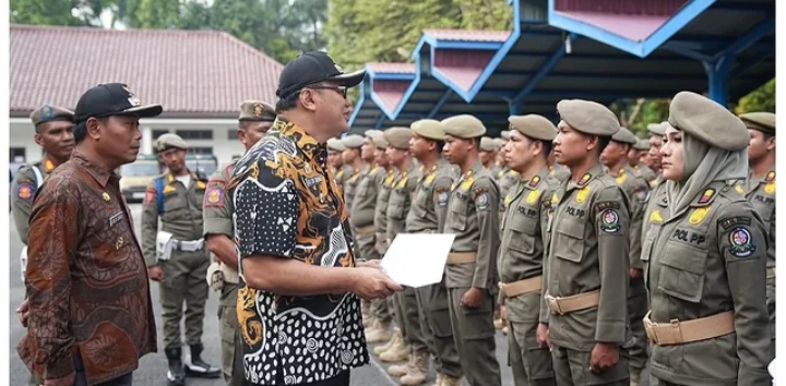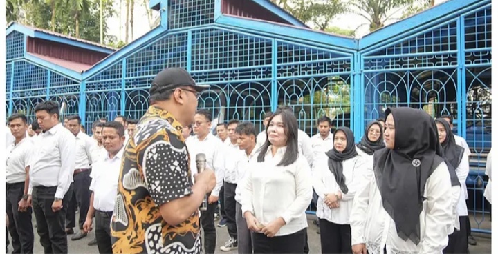 Acara apel berlangsung di lapangan parkir Kantor Bupati Deli Serdang, Jum’at 21/03/2025. Aparatur non Sipil Negara yang bertugas diberbagai dinas badan atau lingkungan Pemkap dipindahkan ke Satpol PP.