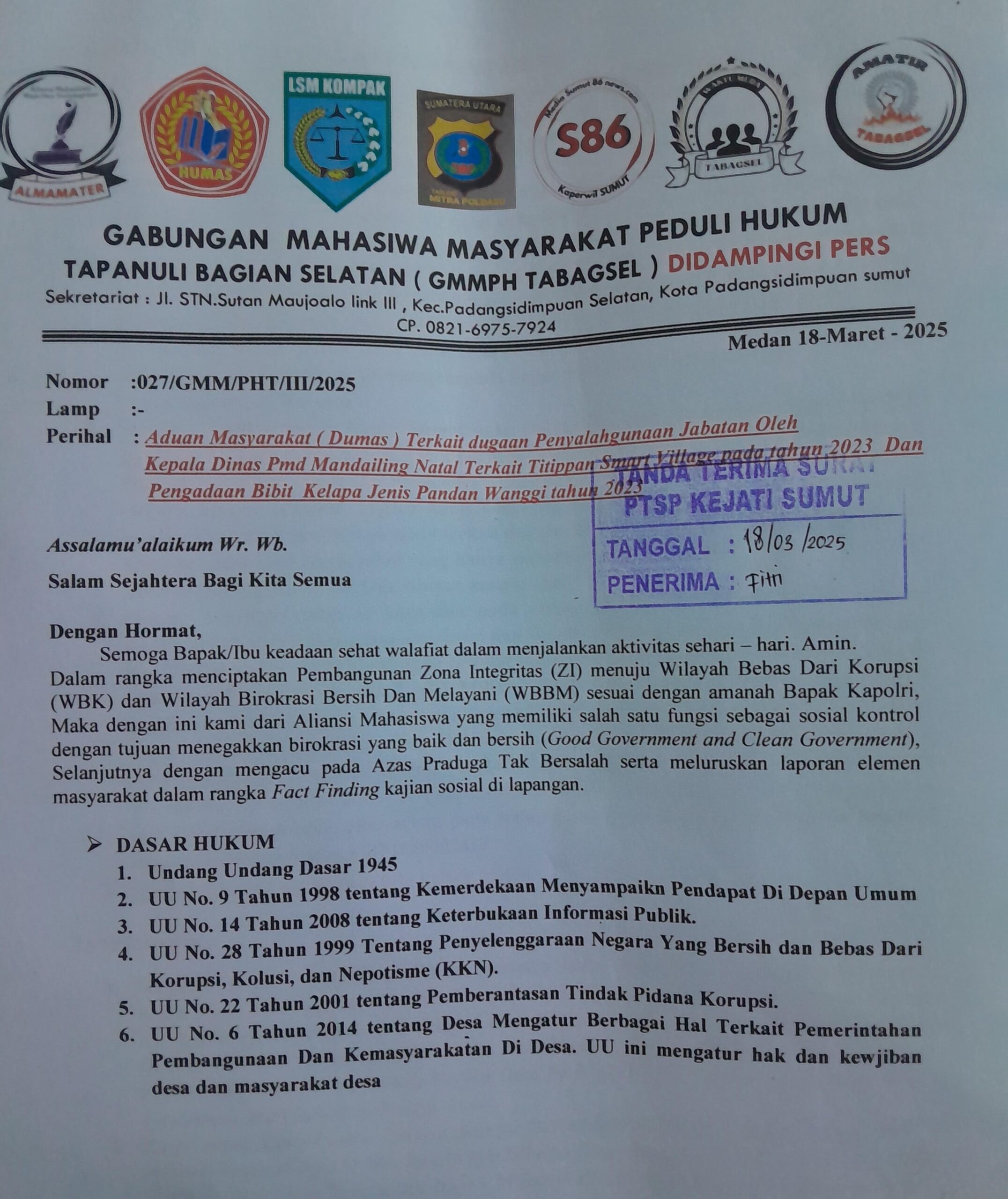 - Meminta kepada Kepala Kejati-Sumut agar memanggil dan memeriksa Kadis PMD Kabupaten Madina, Kabid PMDes Kabupaten Madina dan Vendor sebagai rekanan pada pengadaan aplikasi Smart Village pada desa-desa Se-Kabupaten Mandailing Natal dan juga Pengadaan Bibit Kelapa di desa Se-Kabupaten Mandailing Natal.