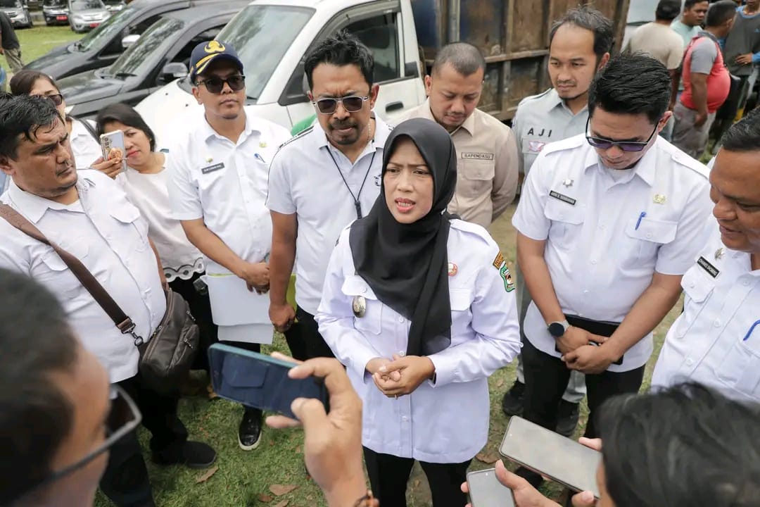 Didampingi Kepala Bidang Aset Badan Pengelola Keuangan dan Pendapatan Daerah (BPKPD) Kota Pematangsiantar Alwi Adrian Lumbangaol SSTP dan Kepala UPT Samsat Pematangsiantar Badan Pendapatan Daerah (Bapenda) Provinsi Sumatera Utara (Sumut) Fuad Ghazali Damanik SSTP MSi, Herlina berkeliling memeriksa kendaraan dinas yang terbaris rapi.