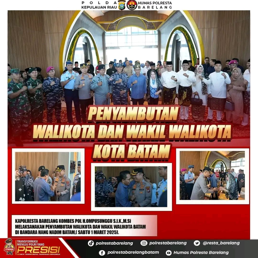 Kapolresta Barelang bersama jajarannya memberikan penghormatan kepada Walikota dan Wakil Walikota Batam yang baru tiba di Bandara Hang Nadim. Penyambutan ini merupakan bentuk penyambutan resmi dan penghormatan kepada pemimpin baru Kota Batam.