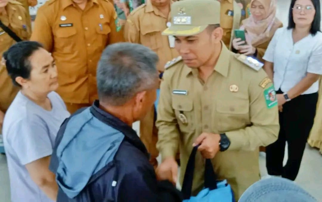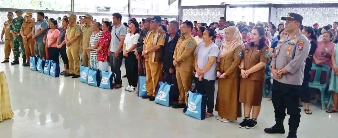 Penyerahan sembako oleh Bupati Simalungun didampingi Wakil Ketua Grib Jaya Kecamatan Girsang Sipangan Bolon Indra Sotohang, Plt Camat Viktor Saragih, Kapolsek Parapat, Koramil 11 Parapat, Kadis BPBD Simalungun Resman Saragih, dan para tokoh adat. (Rill)