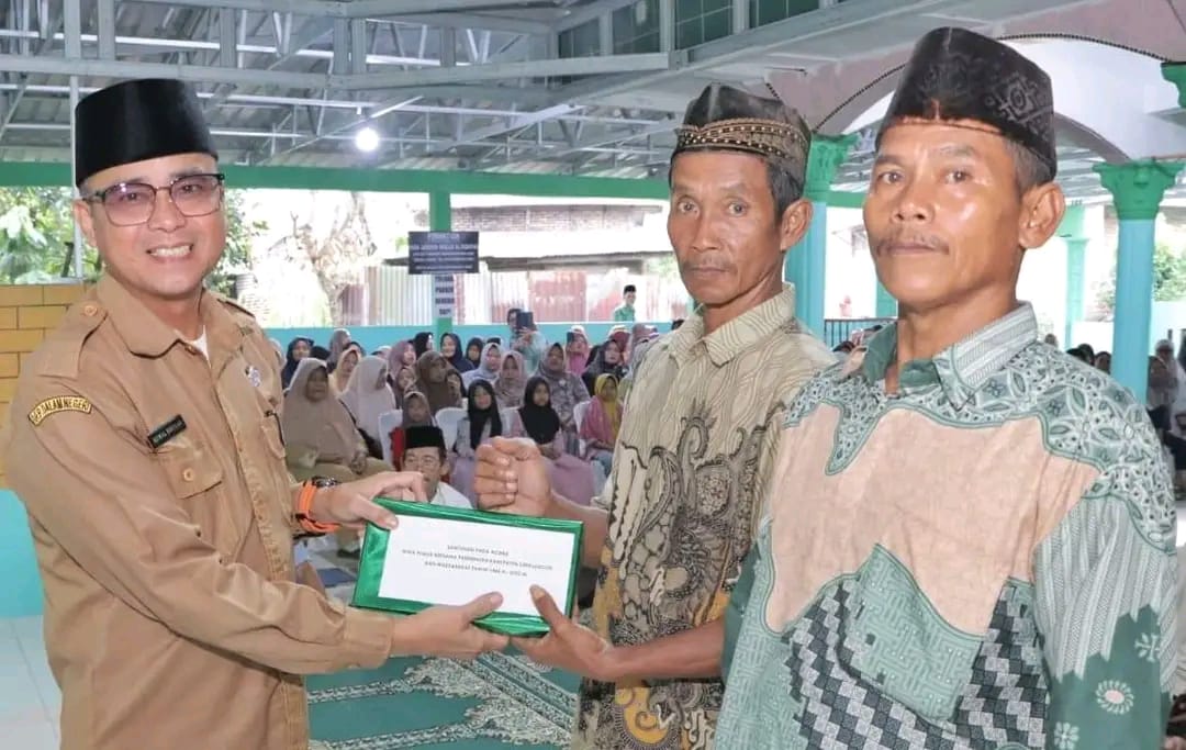 Di masjid An Nur Perdagangan Tim Safari Ramadhan Kabupaten Simalungun memberikan bantuan berupa dua gulung sajadah dan loudspeaker potable satu unit kepada pengurus BKM. (Ril)