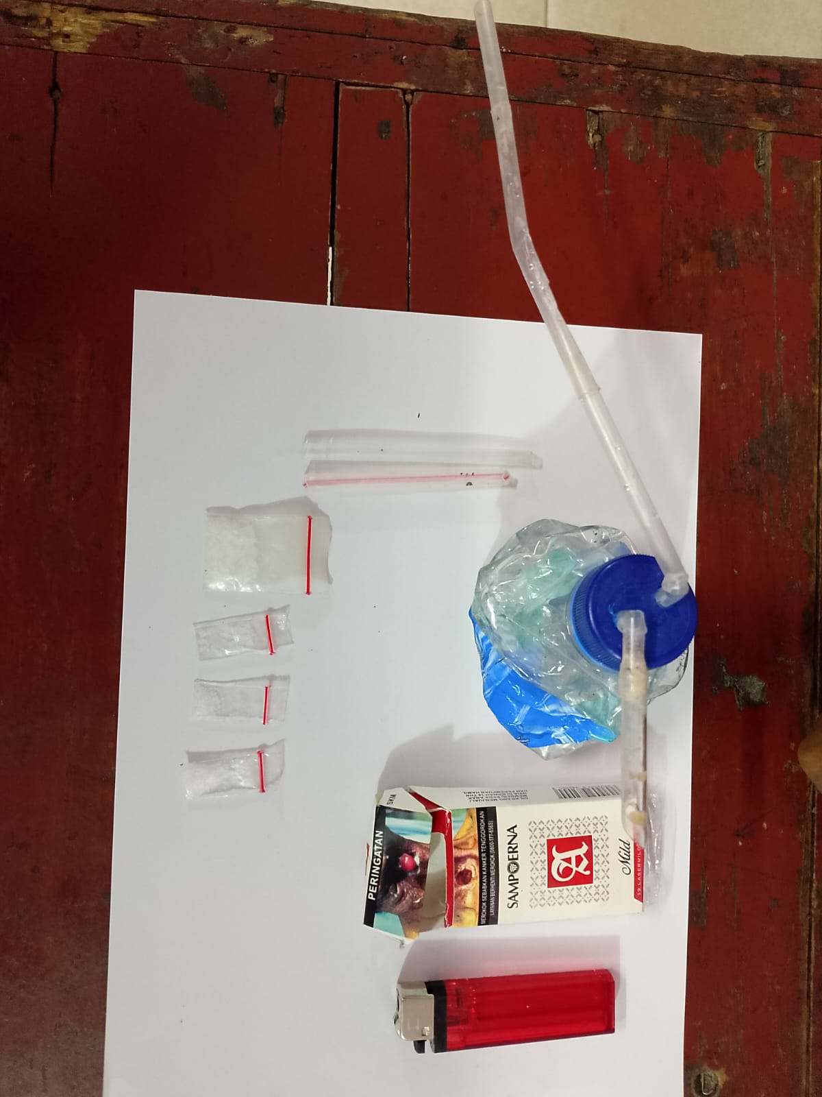 Barang bukti yang disita dari tersangka antara lain: Satu buah bong terbuat dari botol plastik, satu buah kaca pirex berisi sisa bakaran diduga narkoba jenis sabu, tiga bungkus plastik klip berisi diduga narkoba jenis sabu dengan berat total 1,52 gram, dua buah pipet plastik dan satu buah korek api merah.
