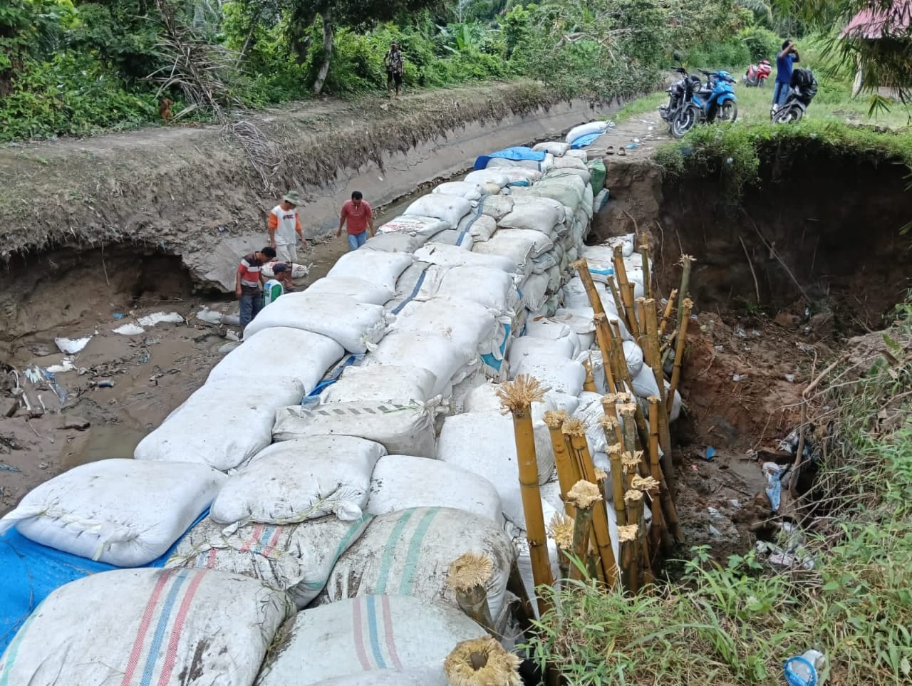 Menghadapi keadaan ini, petani sawah bergotong royong memperbaiki bondar yang jebol secara manual. Mereka telah menyusun ribuan karung berisi tanah untuk membentuk tembok saluran irigasi, berharap hal tersebut dapat mereka gunakan untuk mengairi sawah mereka yang sedang masa tanam.