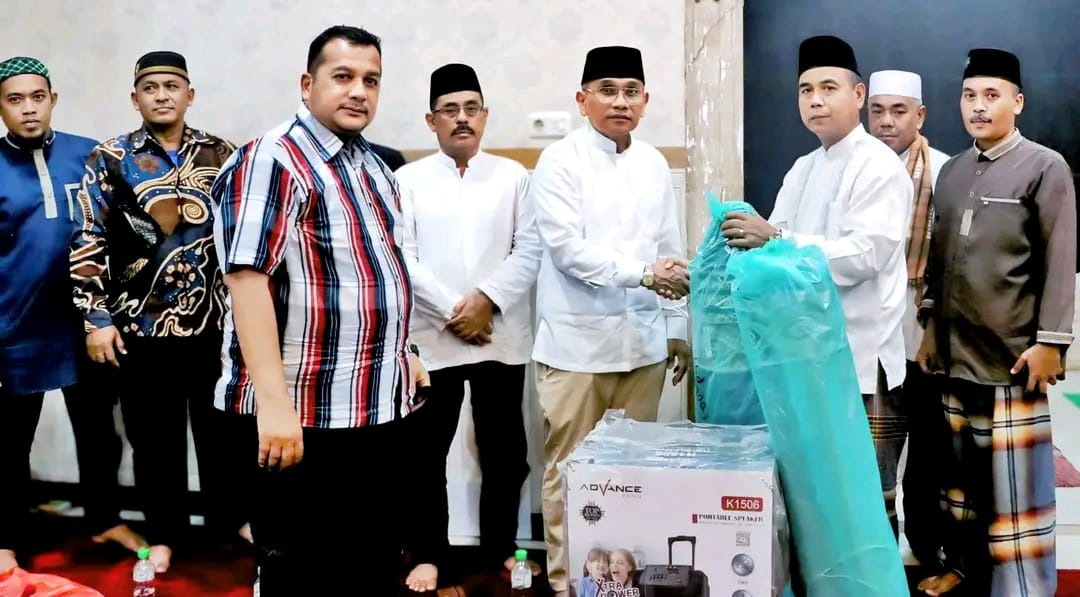 Usai menyampaikan sambutan, selanjutnya Bupati menyerahkan bantuan untuk Masjid Jami’ Nagori Karang Rejo berupa sajadah panjang dan soundsystem portable kepada BKM Jami’ Nagori Karang Rejo.