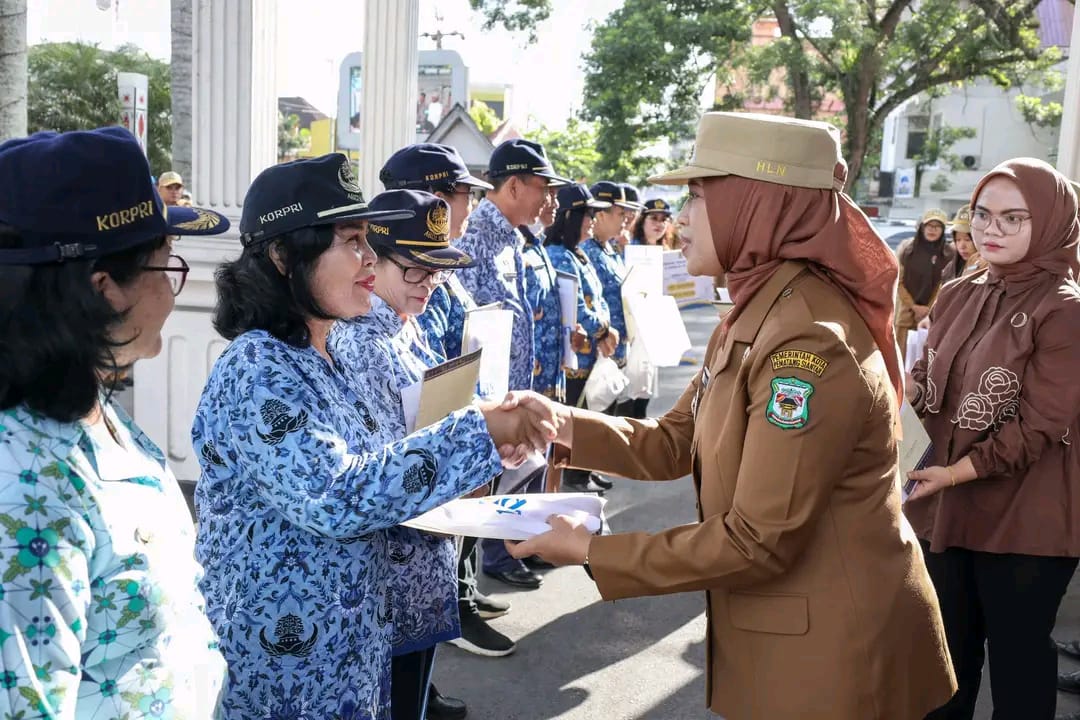 Usai apel, Herlina menyerahkan Surat Keputusan (SK) kepada 11 ASN yang pensiun terhitung April 2025. (Ril)