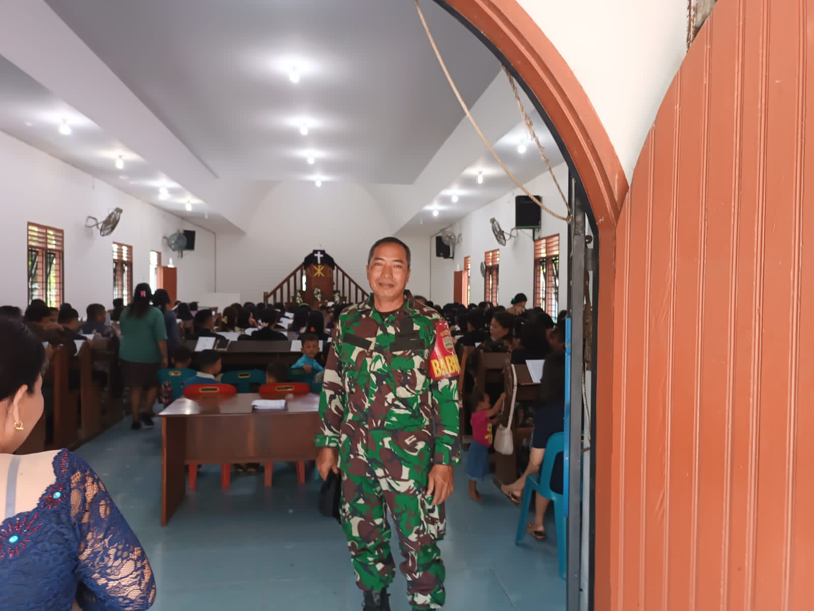 Babinsa Desa Tanjung, Selamat, Pelda Tejo Basuki juga hadir digereja HKBP Palu Gelombang untuk memastikan keamanan Jemaat dalam beribadah dalam Perayaan Jumat Agung.