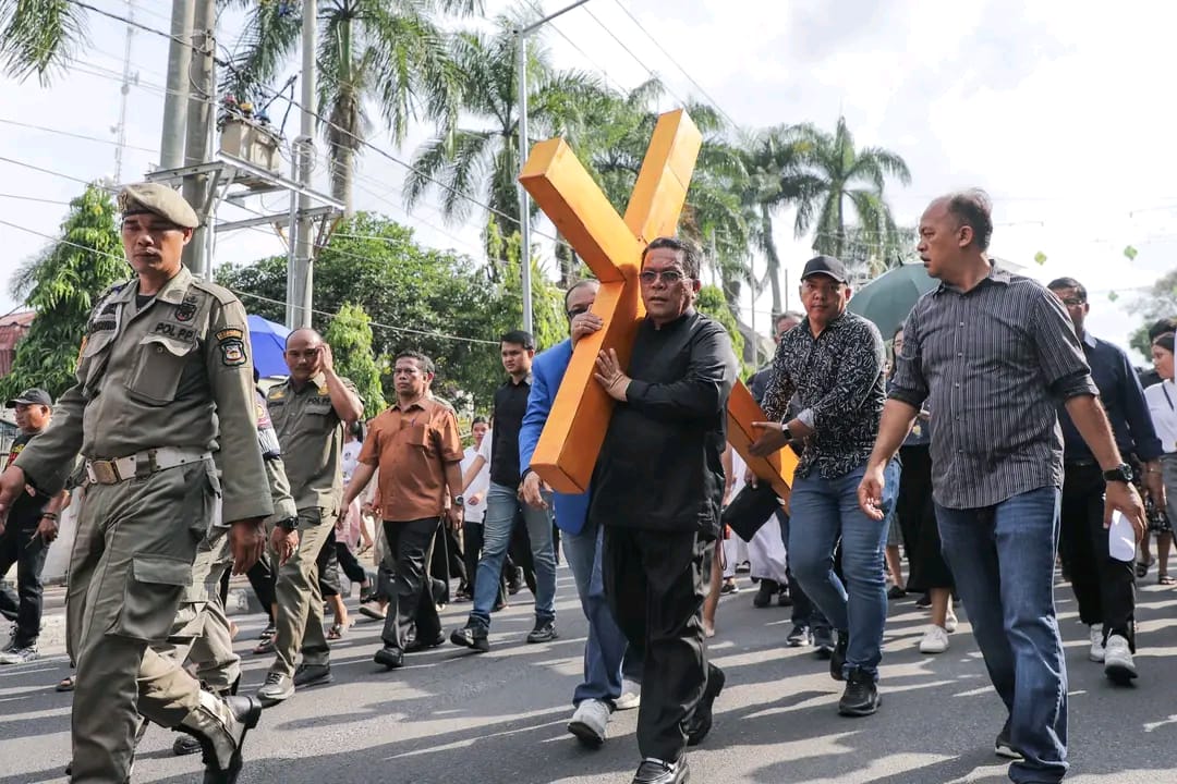 KransNews.com | Siantar – Wali Kota Pematangsiantar, Wesly Silalahi SH MKn mengikuti prosesi Jalan Salib dan turut memikul kayu salib di acara peringatan Wafatnya Yesus Kristus atau Jumat Agung, Jumat (18/04/2025) siang. Prosesi Jalan Salib dimulai dari kampus Universitas HKBP Nommensen Pematangsiantar, Jalan Sang Naualuh Damanik hingga ke depan Balai Kota Pematangsiantar di Jalan Merdeka.