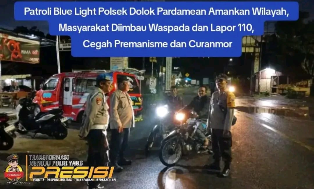 KransNews.com | Simalungun – Dalam upaya menciptakan situasi keamanan dan ketertiban masyarakat (kamtibmas) yang kondusif, Polsek Dolok Pardamean Polres Simalungun melaksanakan patroli Blue Light dan razia untuk mencegah berbagai bentuk gangguan kamtibmas. Kegiatan ini dilaksanakan, Sabtu (10/05/2025) pukul 19.00 WIB di jalan lintas Simarjarunjung, Nagori Parik Sabungan, Kecamatan Dolok Pardamean, Kabupaten Simalungun.