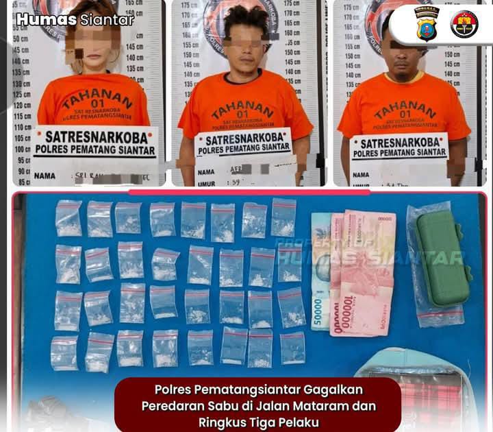 Tiga orang pengedar berhasil diringkus yakni satu orang perempuan berinisial SR alias A (35) warga Jalan Dahlia, Kelurahan Simarito, Kecamatan Siantar Barat, Kota Pematangsiantar serta dua laki laki inisial AML (39) warga Jalan Mataram, Kelurahan Melayu dan AZ (35) warga Jalan Sriwijaya, Kelurahan Baru, Kecamatan Siantar Utara Kota Pematangsiantar.