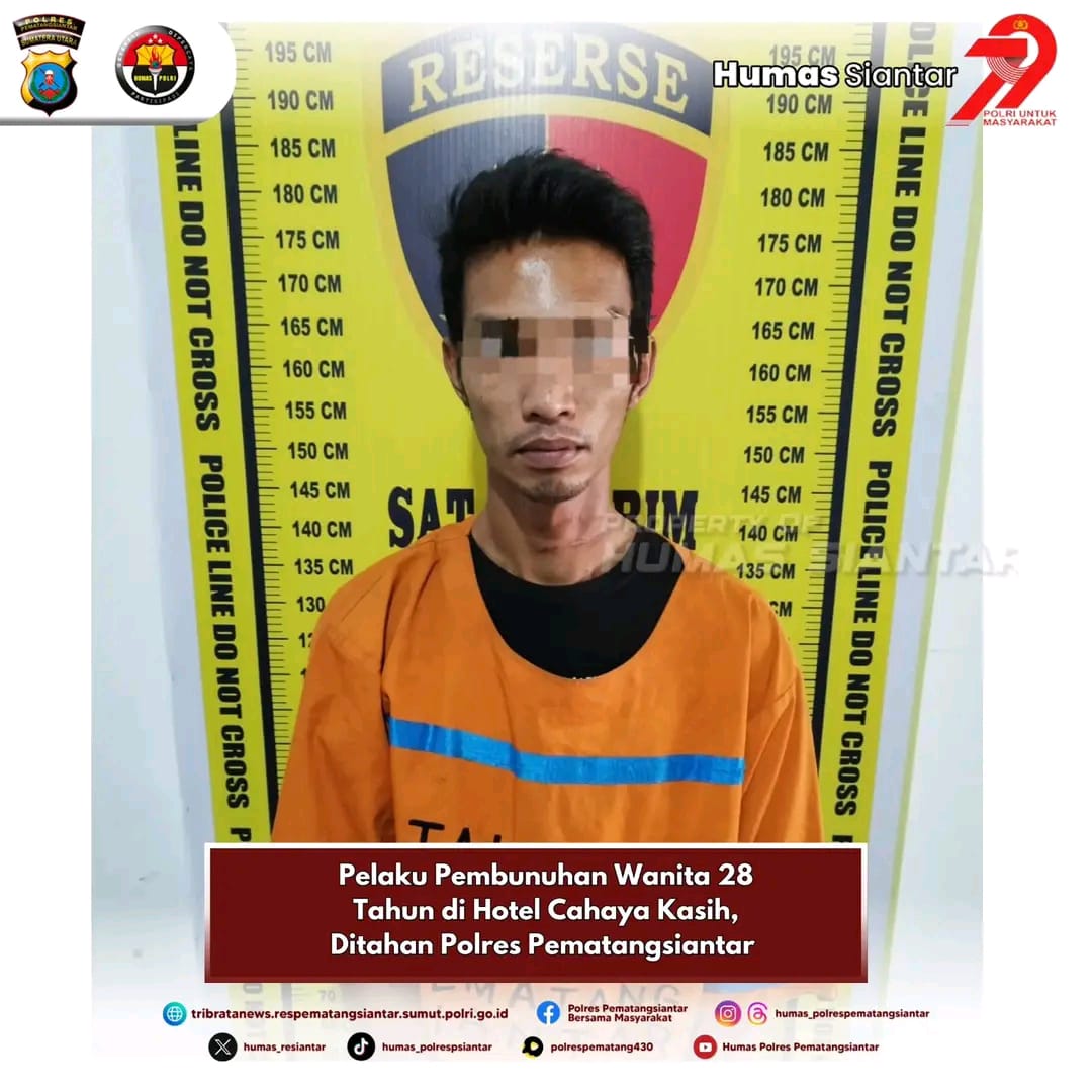 KransNews.com | Siantar- Satuan Reserse Kriminal (Sat Reskrim) Polres Pematangsiantar melalui Unit Jatanras melakukan penahanan terhadap tersangka pembunuhan seorang wanita berumur 28 tahun berinisial JL di Hotel Cahaya Kasih yang terletak di Jalan Bah Binonom, Kelurahan Sigulang-Gulang, Kecamatan Siantar Utara, Kota Pematangsiantar pada hari pada hari Sabtu 21 Juni 2025 sekira pukul 18.30 Wib.