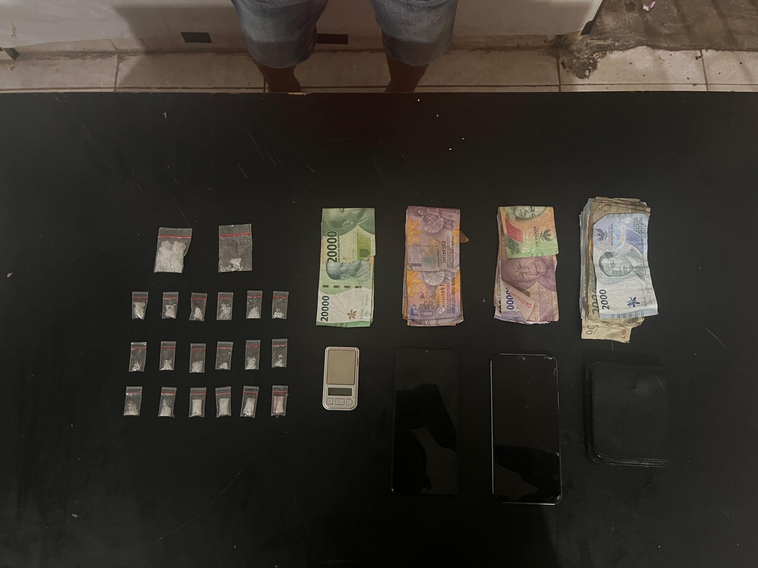 18 paket kecil sabu, 2 paket besar sabu (berat total brutto 10,25 gram), Uang tunai Rp400.000, Timbangan digital, 2 unit handphone dan satu dompet.