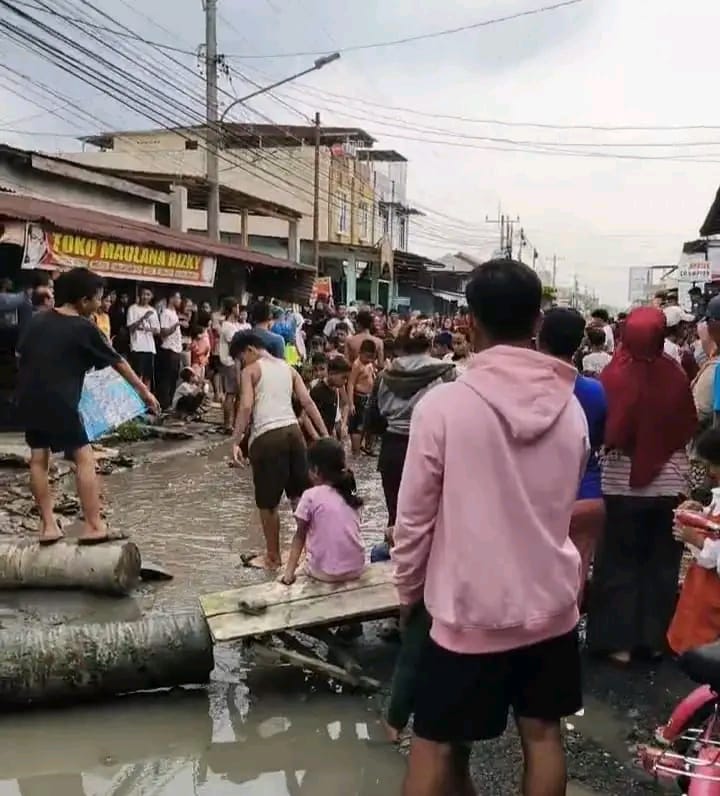 KransNews.com | Deli Serdang – Jalan Srigunting atau Jalan Setia Makmur, Desa Sunggal Kanan, Kecamatan Sunggal jadi lokasi wisata dadakan. Usai ratusan warga melakukan aksi blokir jalan dengan melintangkan batang kelapa dan main air di jalan yang terendam air, Sabtu,26/7/2025.