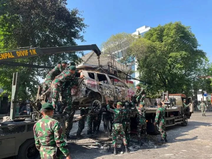 KransNews.com | Jakarta – Usai berlangsungnya aksi damai di kawasan Depan Mako Brimob Kwitang, Jakarta Pusat, Jumat (29/8/2025), prajurit Detasemen Peralatan (Denpal) Divisi Infanteri 1 Kostrad sigap turun tangan membantu proses evakuasi kendaraan yang terjebak di lokasi.