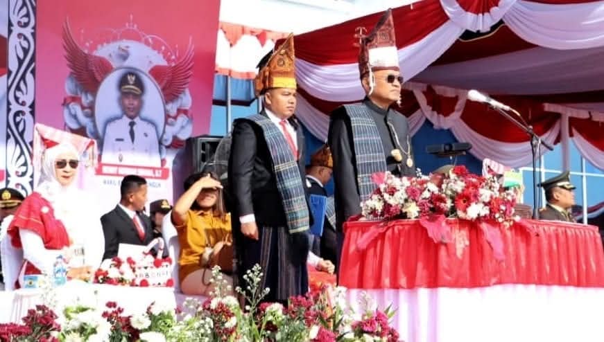 Bupati Simalungun, Dr. H. Anton Achmad Saragih, tampil sebagai Inspektur Upacara, berdiri tegap di bawah teriknya matahari, seolah menjadi simbol keteguhan rakyat Simalungun menjaga semangat kemerdekaan. Didampingi Kapten Inf Bangsawan Harahap sebagai Komandan Upacara dan Kapten Inf Rudianto sebagai Perwira Upacara, prosesi berlangsung tertib dan menggetarkan hati.