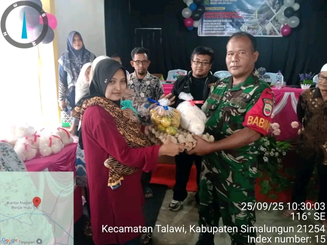 KransNews.com | Simalungun – Babinsa Koramil 07/Bosar Maligas Kodim 0207/Simalungun, Serda J. Saragih, melaksanakan penyaluran Program Makanan Tambahan (PMT) bagi balita di Nagori Banjar Ulu, Kecamatan Ujung Padang, Kabupaten Simalungun, Kamis (25/9).