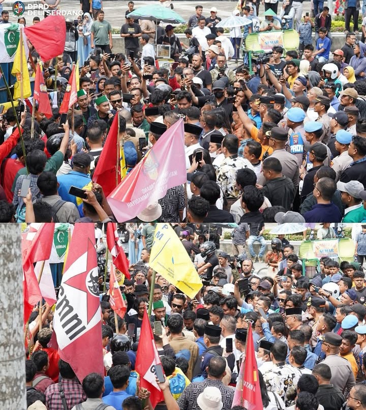 KransNews.com | Deli Serdang – Pimpinan dan anggota Dewan Perwakilan Rakyat Daerah (DPRD) Kabupaten Deli Serdang menerima massa aksi dari Aliansi Cipayung dan Mahasiswa Deli Serdang dalam unjuk rasa yang digelar di depan Kantor DPRD, Senin (1/9/2025).