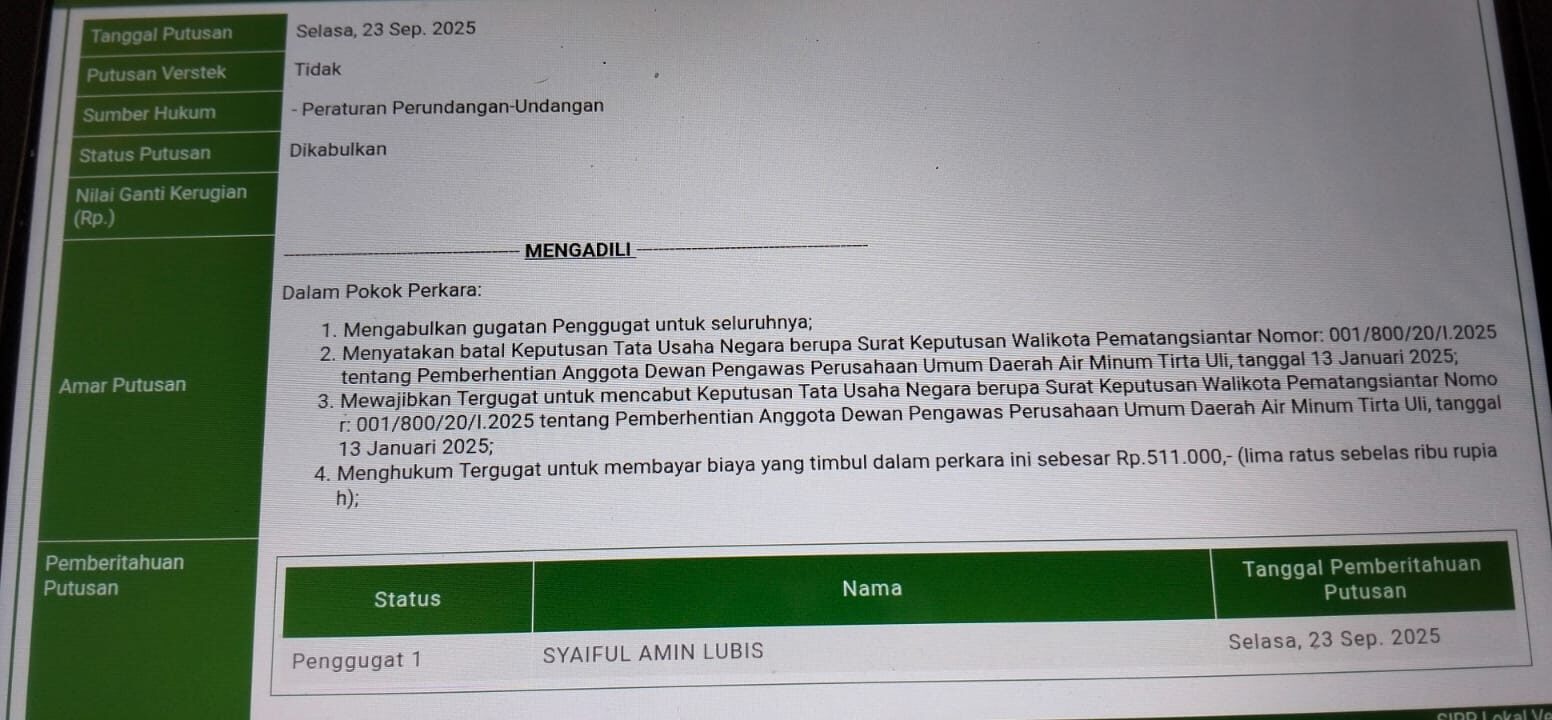 Dalam amar putusan yang dibacakan Selasa (23/9/2025) lalu, Majelis Hakim PTUN Medan yang menangani perkara Nomor: 25/G/2025/PTUN.MDN, menyatakan batal Surat Keputusan (SK) Wali Kota Pematangsiantar Nomor 001/800/20/I/2025 tertanggal 13 Januari 2025 tentang Pemberhentian Anggota Dewan Pengawas PDAM Tirta Uli atas nama Syaiful Amin Lubis ST.