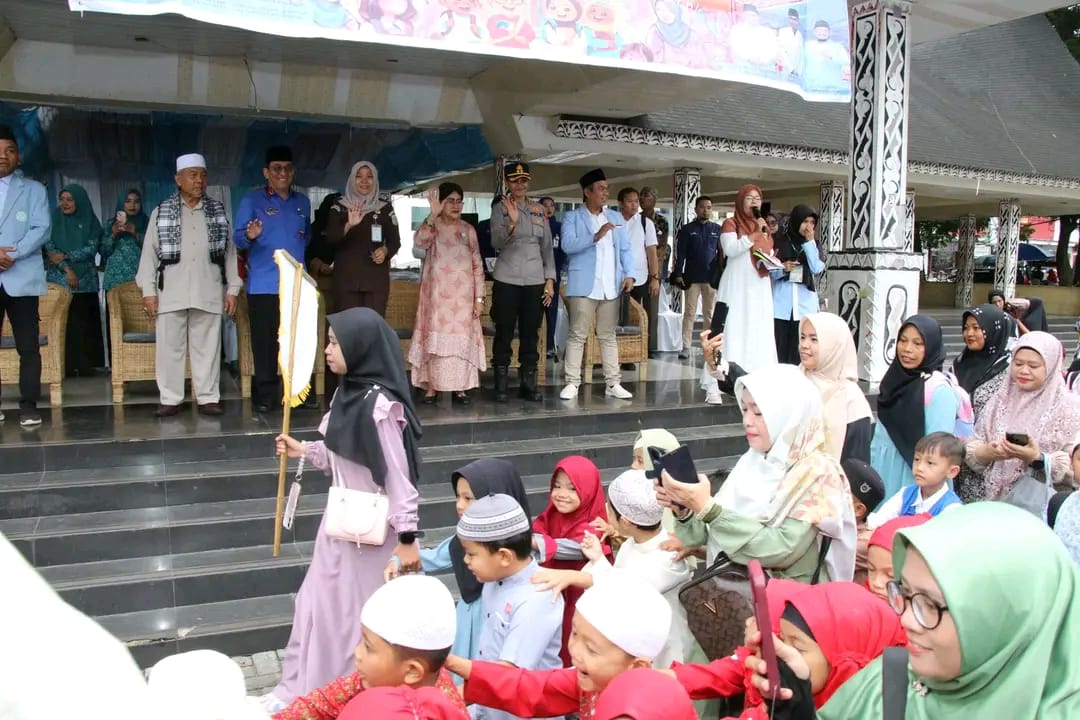 “Dengan menyebut nama Tuhan Yang Maha Esa, maka pelepasan Pawai Ta’aruf Festival Anak Sholeh Indonesia ke-XIII BKPRMI Kota Pematangsiantar Tahun 2025, dengan ini saya lepas,” ucap Ny. Liswati penuh semangat.