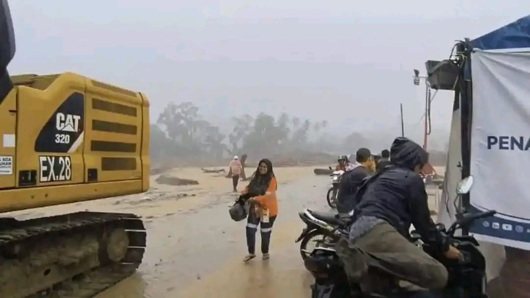 Dalam hitungan 15 menit, debit air meningkat dan mulai mencapai titik jalan yang sebelumnya jebol. Kayu-kayu yang digunakan sebagai jembatan darurat turut terseret arus banjir. Material kayu itu kemudian diangkat menggunakan alat berat agar tidak hanyut lebih jauh ke hilir.