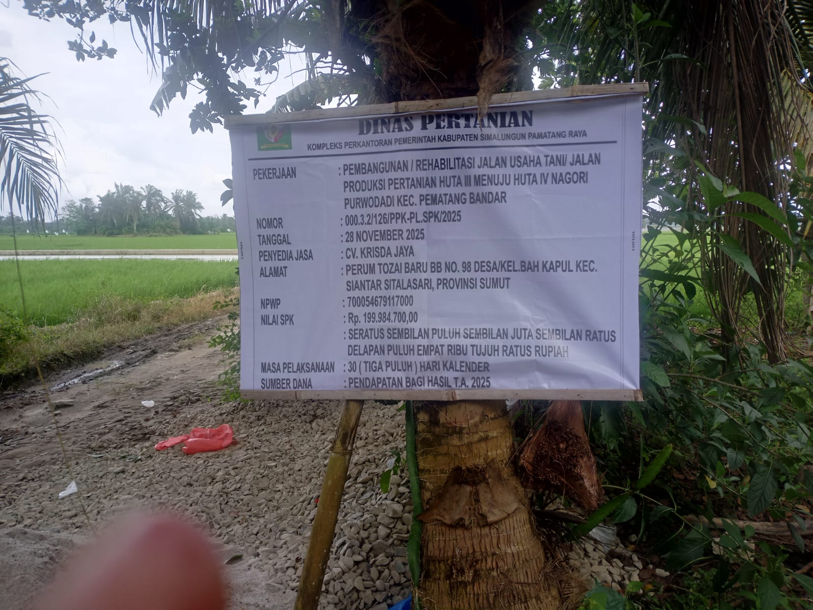 KransNews.com | Simalungun — Proyek pembangunan Rehabilitasi Jalan Usaha Tani atau jalan produksi pertanian di Huta III menuju Huta IV, Nagori Purwodadi, Kecamatan Pematang Bandar, Kabupaten Simalungun, mulai dipertanyakan masyarakat.