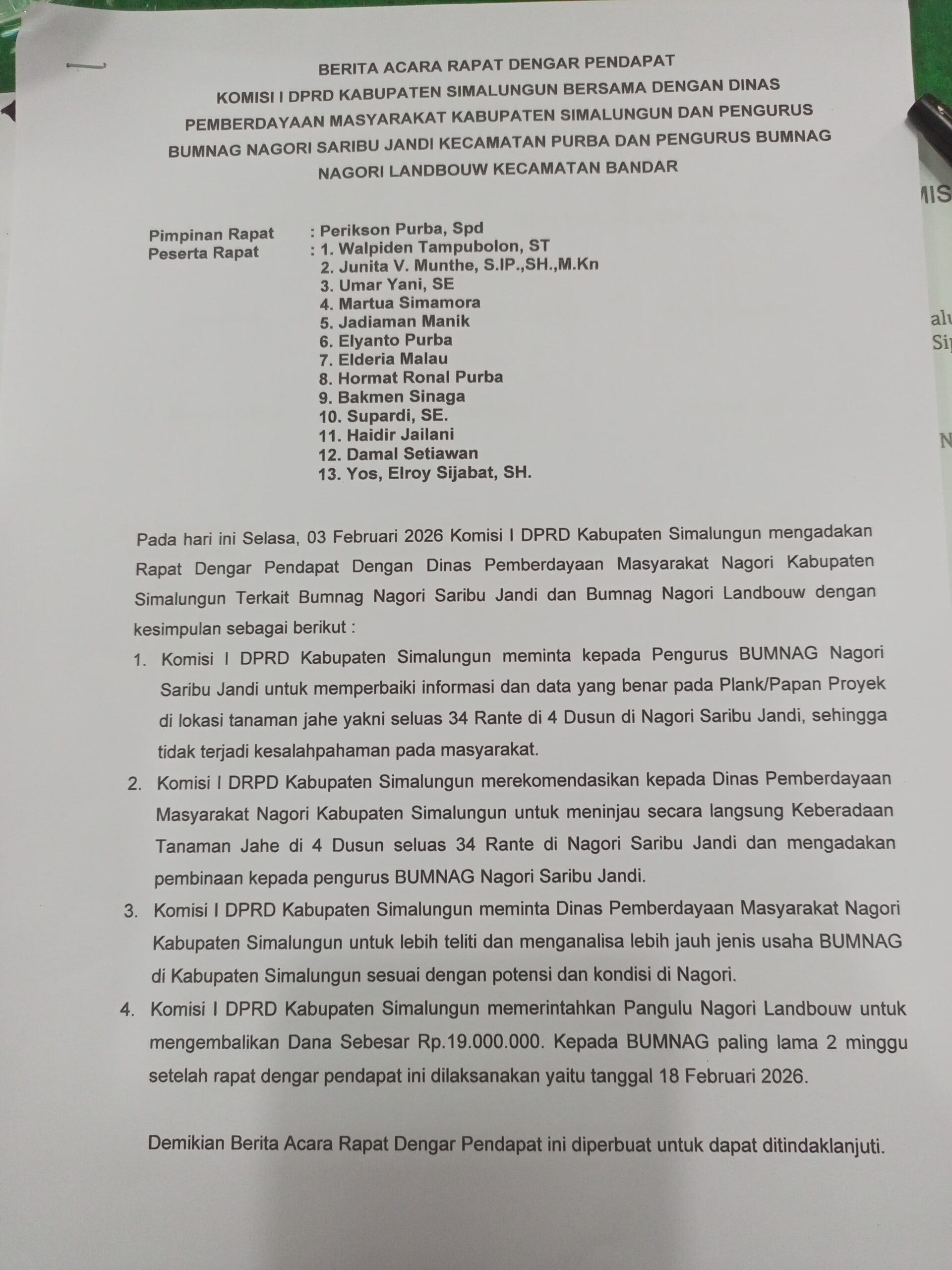Perintah tersebut disampaikan dalam Rapat Dengar Pendapat (RDP) yang digelar pada Selasa, 03 Februari 2026, bersama Dinas Pemberdayaan Masyarakat dan Nagori (PMN) Kabupaten Simalungun serta pengurus BUMNag.